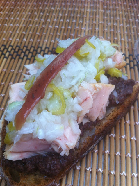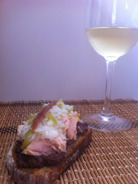 Como ven, el "invento" fue de lo más sencillo. Tostamos una rebanada de pan casero (Hogaza de pan tradicional con masa madre). Cortamos un par de anchoas muy pequeñitas, las mezclamos con la crema de aceitunas negras y untamos el pan con ella. Troceamos el bonito "a grosso modo" y lo colocamos sobre la crema. Cortamos la cebolla en brunoise muy pequeñito y las piparras en rodajas muy finas y lo mezclamos todo en un recipiente con un chorrito de buen aceite de oliva virgen extra. Colocamos la mezcla sobre el bonito y, por último, coronamos con un filete de anchoa.
