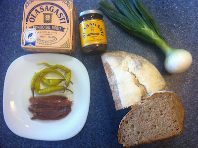 Así que lo que les traemos hoy, más que una receta, es un relato de como disfrutamos de tan maravillosos manjares. Y es que no se nos ocurrió una forma mejor de "nortesunear" que la de combinar el bonito del norte, con unas deliciosas anchoas del cantábrico en salazón y una piparras en vinagre (langostinos de Ibarra)... Y he aquí el resultado...