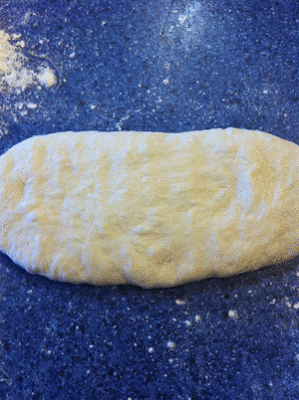Dividimos la masa en tres porciones y formamos la baguette siguiendo los siguientes pasos: untamos la mesa de trabajo con un poco (muy poco) de harina, colocamos la masa con la parte lisa hacia abajo, golpeamos levemente la masa con la palma de la mano (para desgasificar), ahora doblamos uno de los laterales hacia el centro de la masa (presionamos ligeramente para que quede adherida), giramos la masa y hacemos lo mismo con el otro lateral.