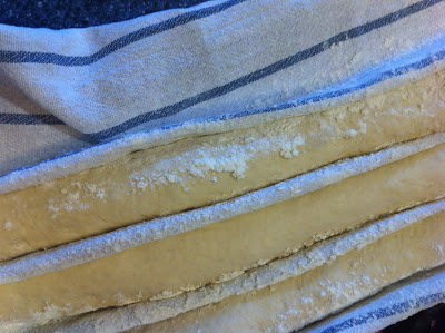 Nos queda un último levado. Ponemos un trapo de lino (o algodón en su defecto) enharinado sobre una bandeja y colocamos la primera pieza de pan, hacemos una doblez en el paño antes de colocar la siguiente pieza (a modo de barrera para que las masas no se toquen), hacemos otra doblez y colocamos la última pieza.