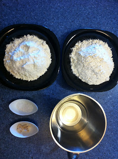 Para empezar ponemos en un recipiente pequeño el agua y la levadura desmenuzada. En un recipiente amplio ponemos toda la harina y la sal y removemos para que la sal quede bien integrada. A continuación añadimos los líquidos al recipiente de la harina y volvemos a remover.